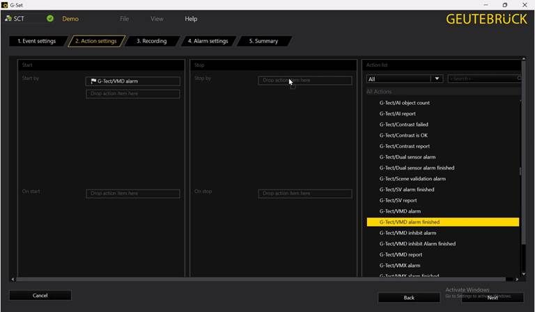 Figure 18: Step 2 — Action Settings. G-Tect/VMD alarm assigned as the Start action. The Action list shows all available triggers.