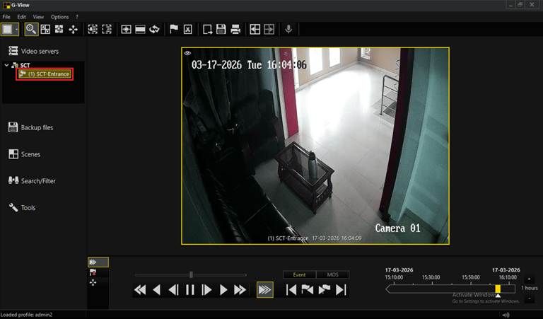 Figure 13: G-View live feed — SCT-Entrance channel streaming with timeline visible.