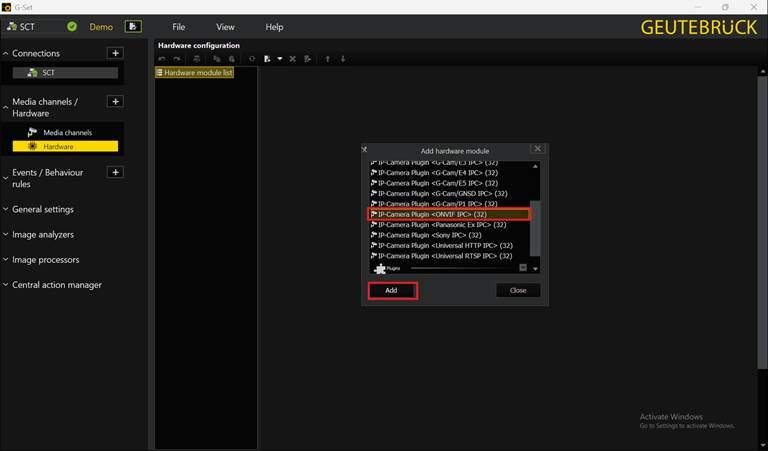 - In the Add hardware module dialog, select IP-Camera Plugin