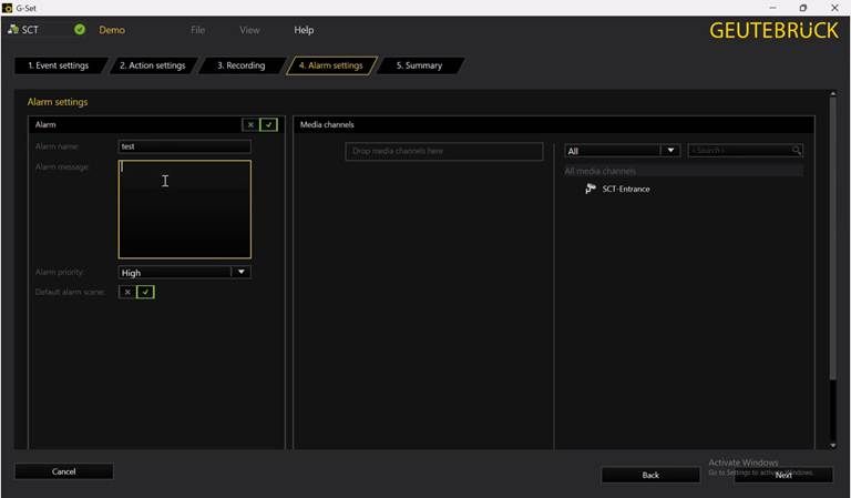 Configure the alarm that appears in G-View and GCXONE when the event fires.