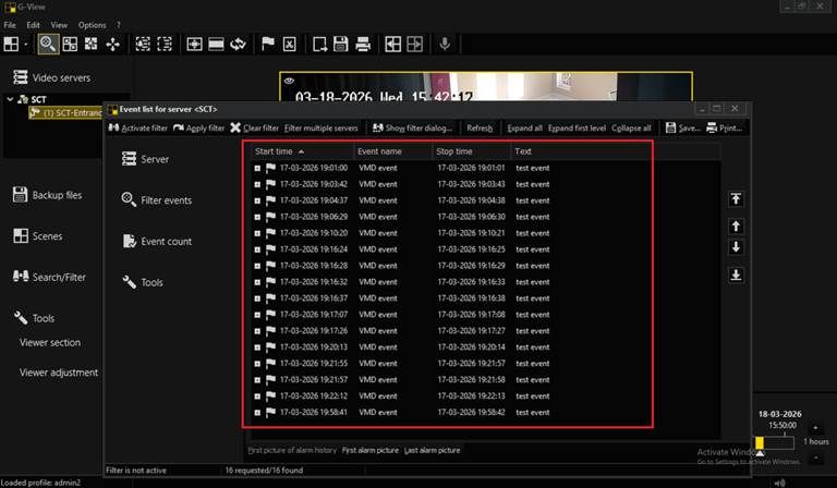 Figure 24: G-View Event list — VMD events logged with start time, stop time, event name, and description. A populated log confirms end-to-end integration.