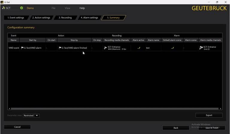 Figure 21: Step 5 — Configuration Summary. VMD event with G-Tect/VMD alarm trigger, SCT-Entrance recording, and test alarm confirmed.