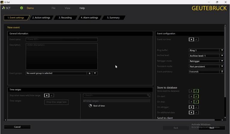 Once events are saved in G-Set, they are automatically transmitted to GCXONE via the device integration. No additional configuration is required in GCXONE to receive Geutebrück events — they appear in the GCXONE event log alongside other device events.