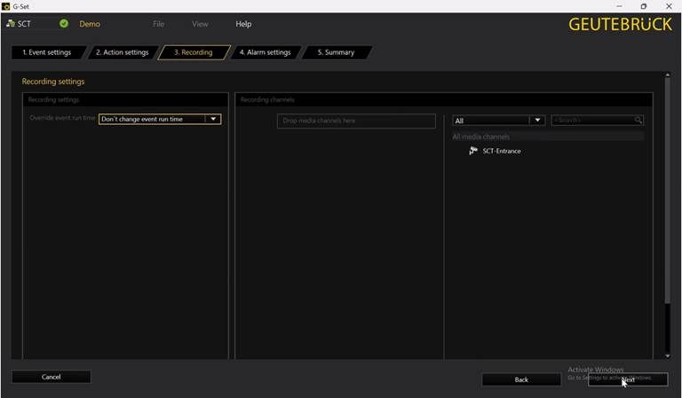 Figure 19: Step 3 — Recording Settings. SCT-Entrance is available in the media channels list.