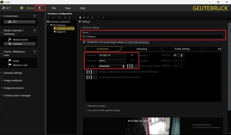 Figure 7: Hardware configuration panel — enter camera name, hostname, and credentials.