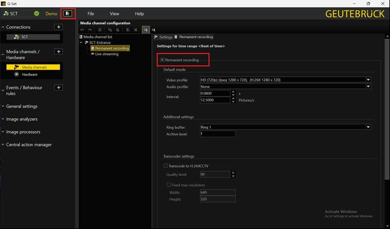 - Select the channel in the tree, open Permanent recording, enable it, and click Save. The sensor is now added and linked.