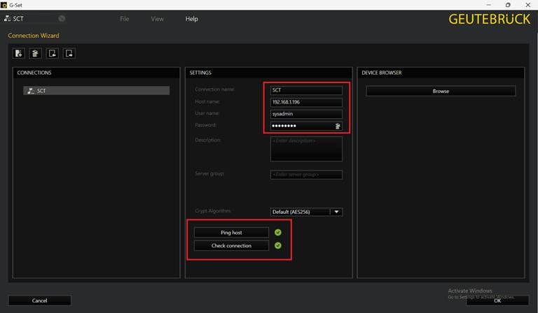 - Enter the Connection name, Host name (G-Core server IP), Username, and Password. Default credentials: username = sysadmin, password = masterkey. Click Ping Host and Check Connection to verify, then click OK.