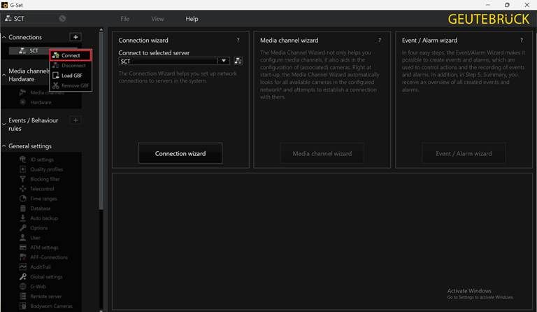 - Launch G-View. In the Video servers panel, right-click the server name and select Connect.