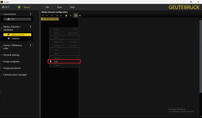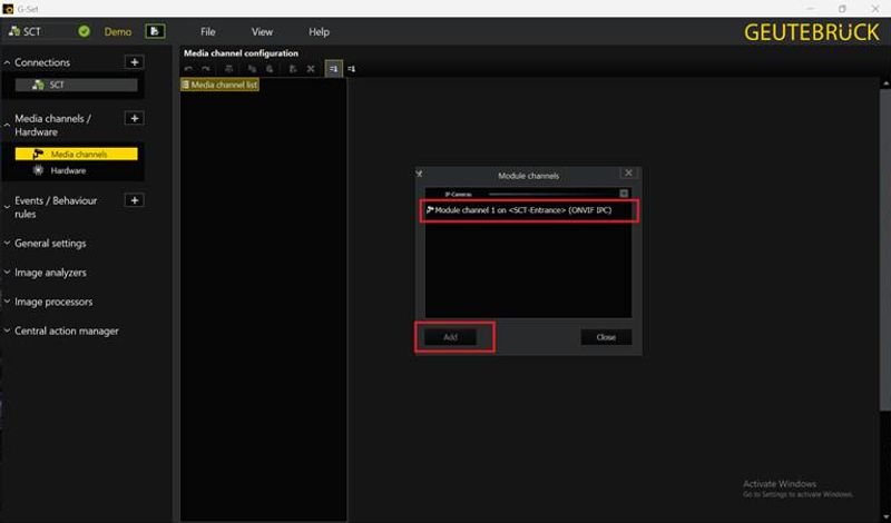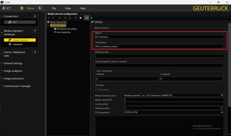 A media channel in G-Set is what GCXONE recognises as a sensor. It links a video stream from a hardware module to the GCXONE device.