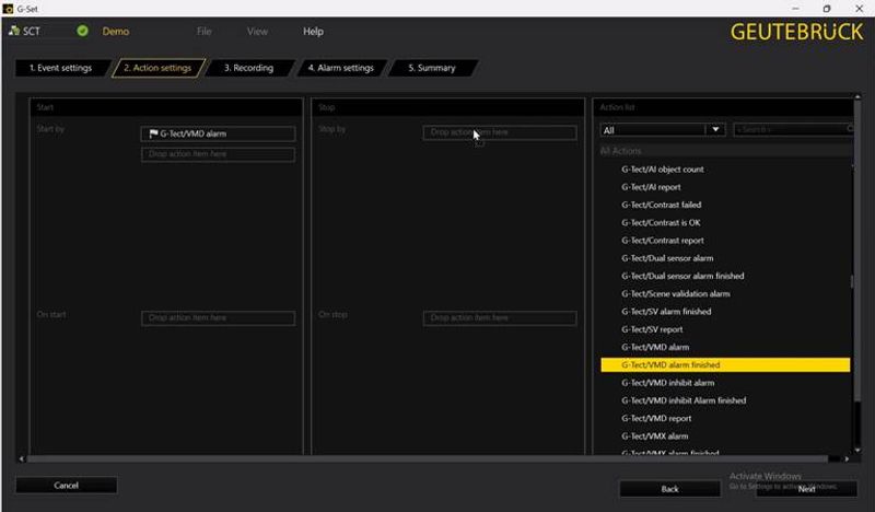 Figure 18: Step 2 — Action Settings. G-Tect/VMD alarm assigned as the Start action. The Action list shows all available triggers.