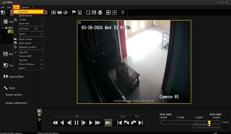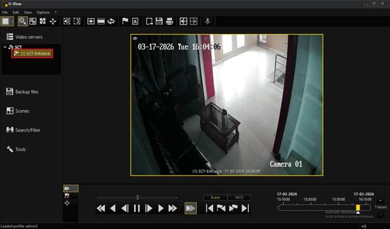 Figure 13: G-View live feed — SCT-Entrance channel streaming with timeline visible.