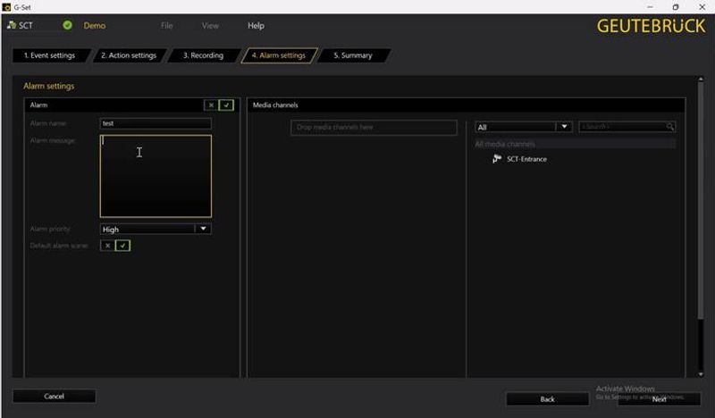 Figure 20: Step 4 — Alarm Settings. Alarm name, priority, and associated media channel are configured.