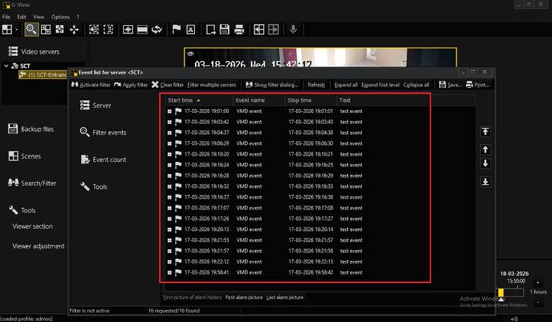 All triggered events are logged in the G-View Event list. A populated log confirms the device is online and events are being captured correctly.