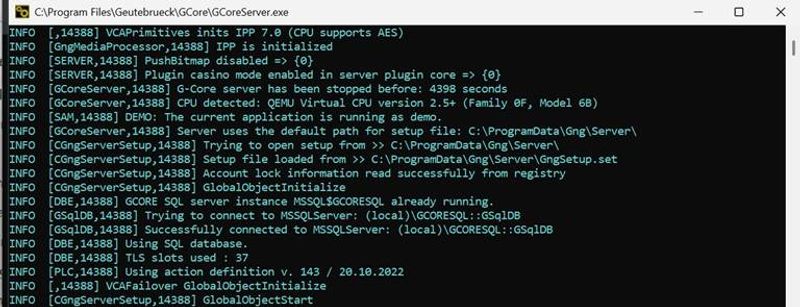 - Start G-Core — use Demo mode for testing (GCoreServer.exe demo) or Licensed mode for production (GCoreServer.exe start).
