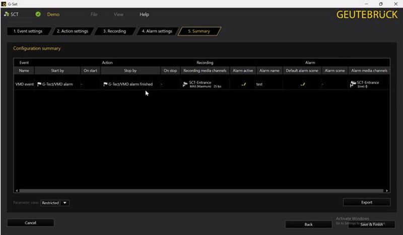 Figure 21: Step 5 — Configuration Summary. VMD event with G-Tect/VMD alarm trigger, SCT-Entrance recording, and test alarm confirmed.