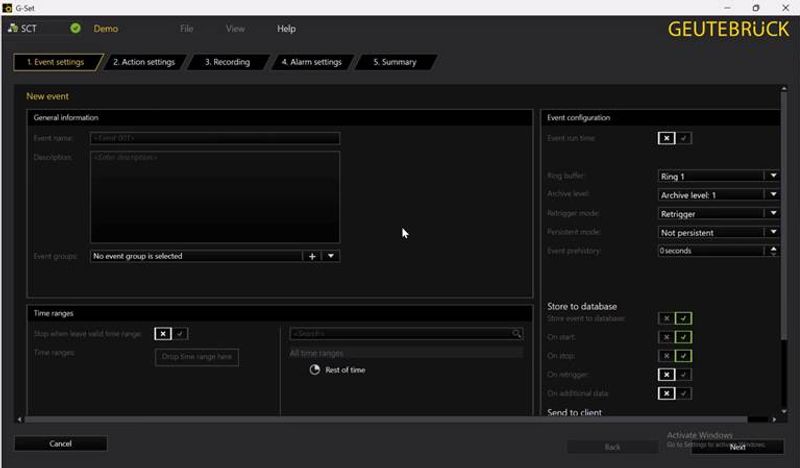 Figure 17: Step 1 — Event Settings. Configure the event name, ring buffer, retrigger mode, and database logging.