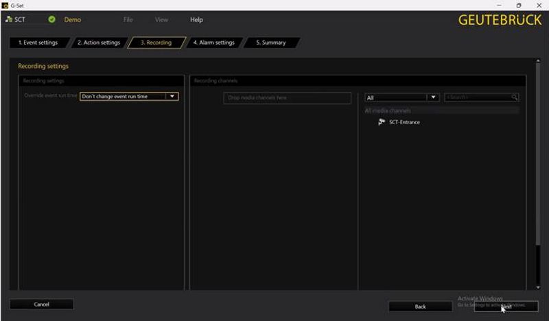 Figure 19: Step 3 — Recording Settings. SCT-Entrance is available in the media channels list.