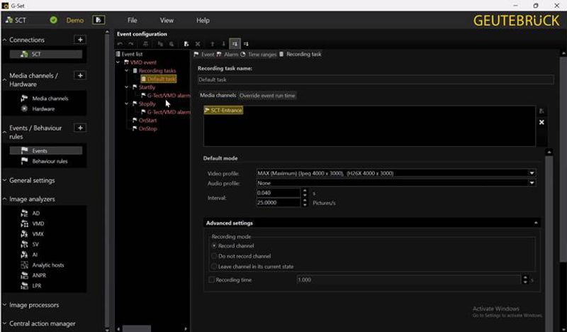 Figure 22: Event configuration detail — VMD event tree showing Recording tasks, StartBy, StopBy, and recording profile at 25 fps on SCT-Entrance.