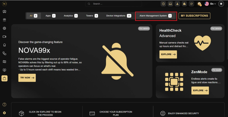 Step 1. Go to Marketplace from the left navigation, then click the Alarm Management System tab to filter the available integrations.