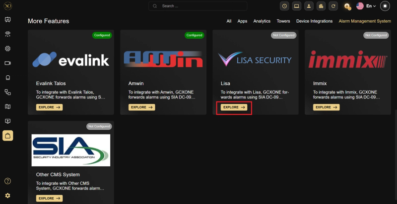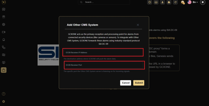 - A DC-09 monitoring center routes alarms from Amwin, Lisa, Immix, or any SIA DC-09 receiver directly from GCXONE, without touching a secondary tool.