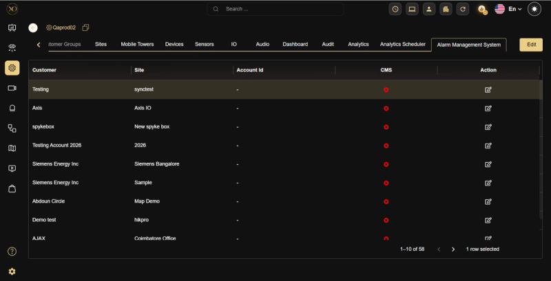 Step 5. A new Alarm Management System tab appears. Navigate to Configuration to access the site mapping table. It lists every site under your service provider, along with the Customer, Site, DC09 Account ID, assigned receiver, and connection status.