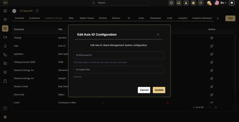Step 7. Click Update to save. From this point on, GCXONE forwards alarms via DC-09, each one carrying a secure event link that CMS operators can open to review the full alarm context.