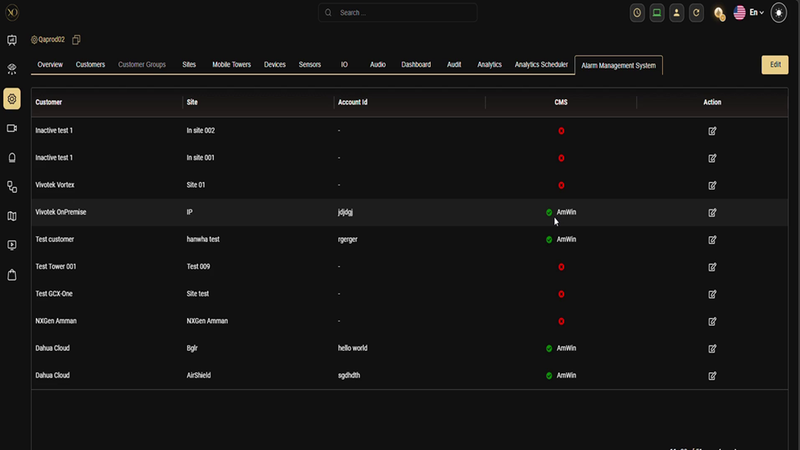 Step 5. A new Alarm Management System tab appears. Navigate to Configuration to access the site mapping table. It lists every site under your service provider, along with the Customer, Site, DC09 Account ID, assigned receiver, and connection status.