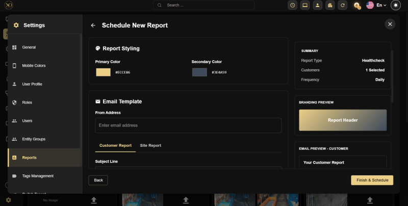 Step 6 – Report Styling & Email Template (Fig 11.f) Configure branding colors and email template, then click Finish & Schedule.