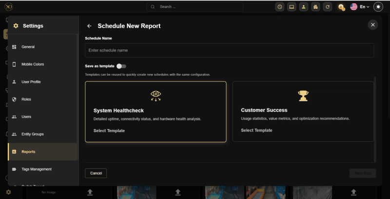 | Report Type | System Healthcheck (uptime, connectivity, hardware health) or Customer Success (usage statistics and optimization recommendations). |