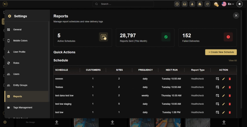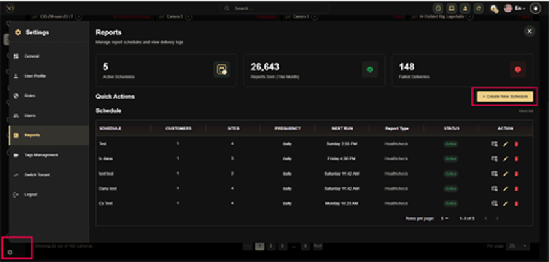 - Active Schedules, Reports Sent This Month, and Failed Deliveries