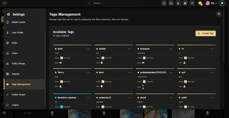 Organize cameras, sites, and devices using Tags - labels with custom names, colors, and icons.