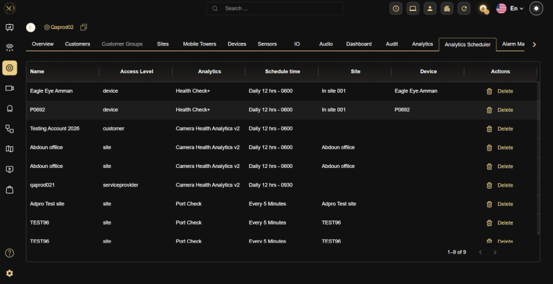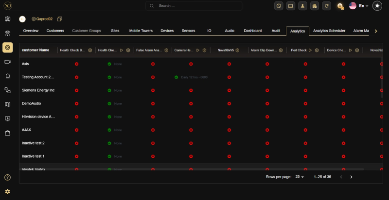 The Analytics Scheduler lists all active HealthCheck jobs across all customers. Use it to audit coverage and find sites with no active schedule.