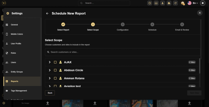 | Customers & Sites Scope | Select which customers and sites are included in each report schedule. |