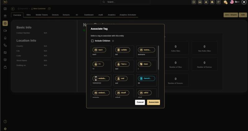 Once tags are created, you can associate them with any entity in the hierarchy: Customers, Sites, Devices, and Sensors. This is done directly from the entity's detail page or overview panel.