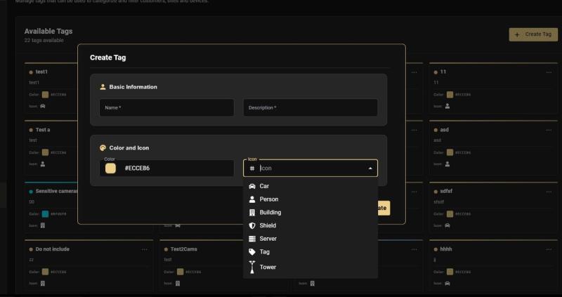 #ECCE86for gold,#0FD6F0for cyan). - Icon β A visual symbol: Car, Person, Building, Shield, Server, Tag, or Tower. Helps operators recognize tag types at a glance.