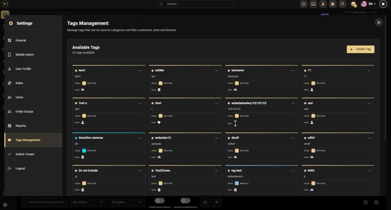 Tags are especially useful when entities need to be grouped across different parts of the hierarchy. For example, you can tag specific cameras from different sites and customers as "Sensitive cameras" and then view or filter them all in one place β regardless of where they sit in the tree.