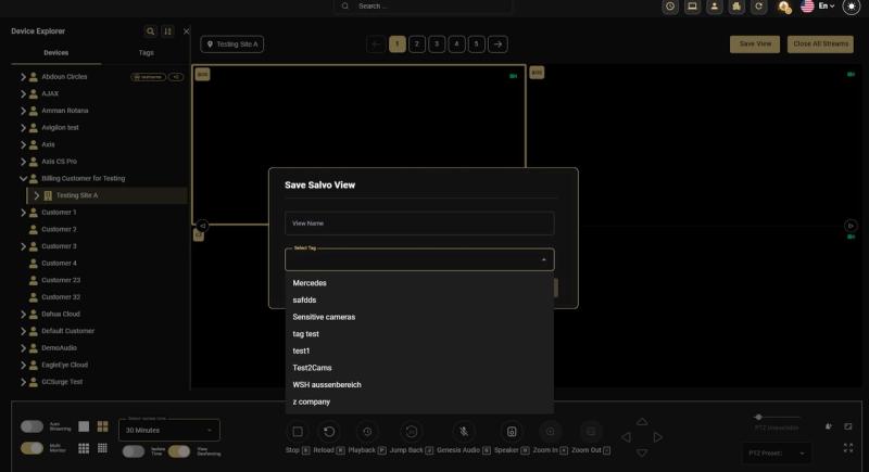 A Salvo View is a saved multi-camera layout in GCXONE's live view. You can save any arrangement of open camera streams as a view and recall it with a single click. Tags can be attached to saved views to keep them organized.