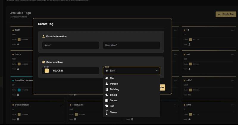 Icon Options β The available icons are: Car, Person, Building, Shield, Server, Tag, and Tower. Choose the icon that best represents what the tag describes β for example, use Building for site-related tags, Car for vehicle monitoring areas, or Shield for high-security zones.