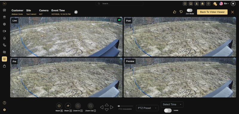 - Event Review (4-Panel View) - View Live, Pre, Post, and Preview feeds side by side. Review full event context in a single screen.