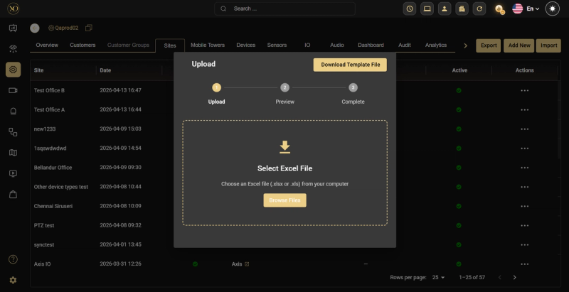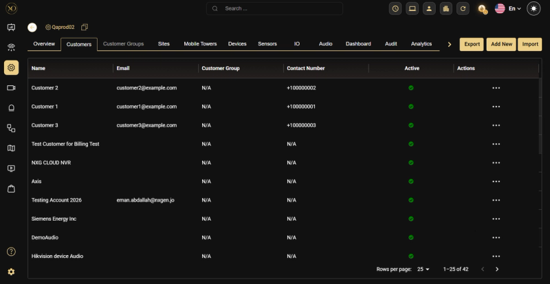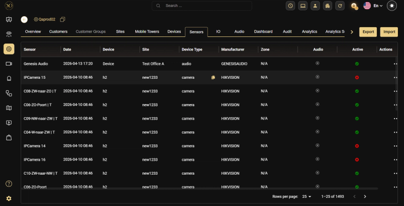 Overview Β· Customers Β· Customer Groups Β· Sites Β· Mobile Towers Β· Devices Β· Sensors Β· IO Β· Audio Β· Dashboard Β· Audit Β· Analytics