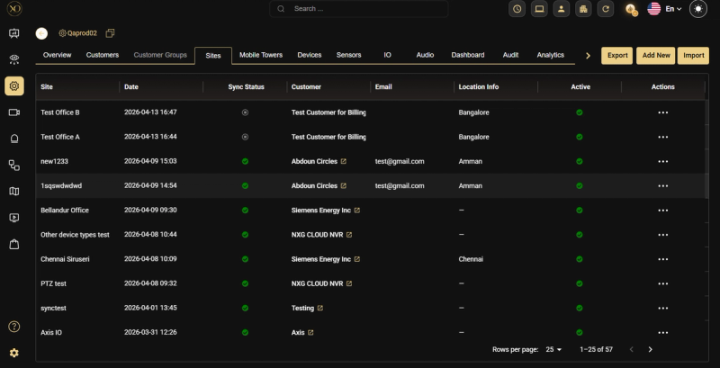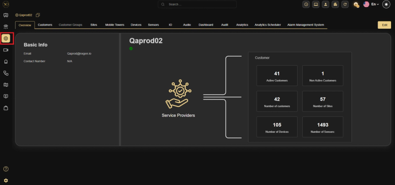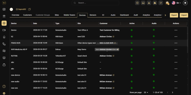 Overview Β· Customers Β· Customer Groups Β· Sites Β· Mobile Towers Β· Devices Β· Sensors Β· IO Β· Audio Β· Dashboard Β· Audit Β· Analytics