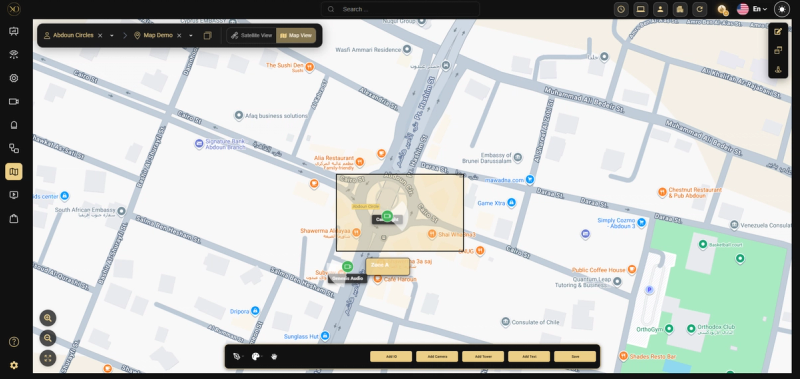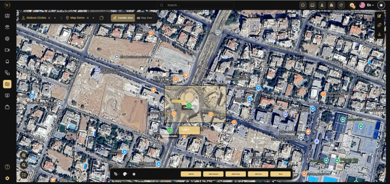 Maps gives you a geospatial overview of all your customer sites on a live satellite or road map. As an operator, you use Maps to quickly locate a site, see camera positions and zone labels, and get instant location context when responding to alarms.
