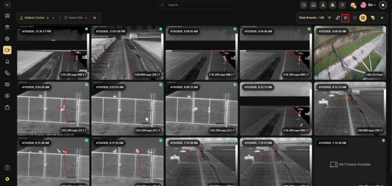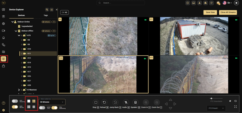 Open Video Viewer from the left navigation. Select a site or device to load cameras, then choose your grid layout: Quad View (2×2), 3×3 Grid, or 4×4 Grid.