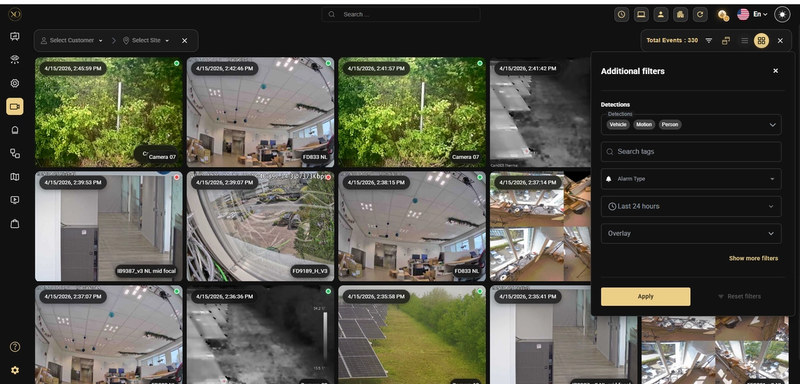 Use the filter panel in Video Search to narrow your results. Select Customer β Site β Device β Sensor in sequence, then choose Alarm Type, set a Time Period, or use the Detection Filter to search for specific event types.