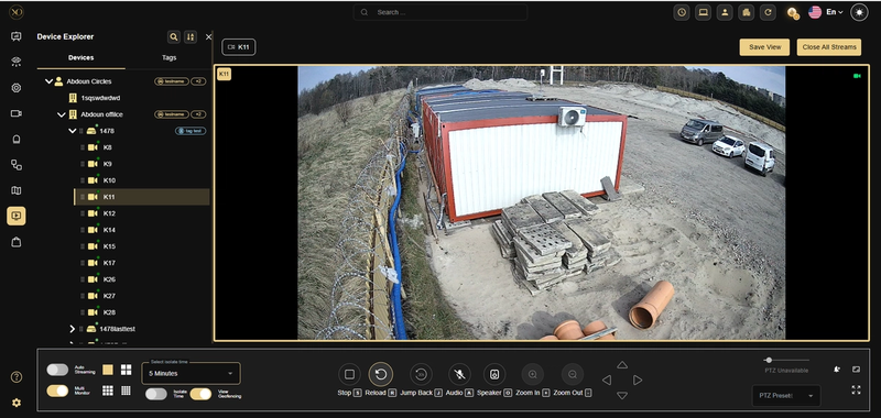 - PTZ Control — Pan, Tilt, Zoom using the directional arrow controls on the right side of the toolbar. Shows “PTZ Unavailable” if the camera does not support PTZ. Use PTZ Preset to jump to a saved camera position.