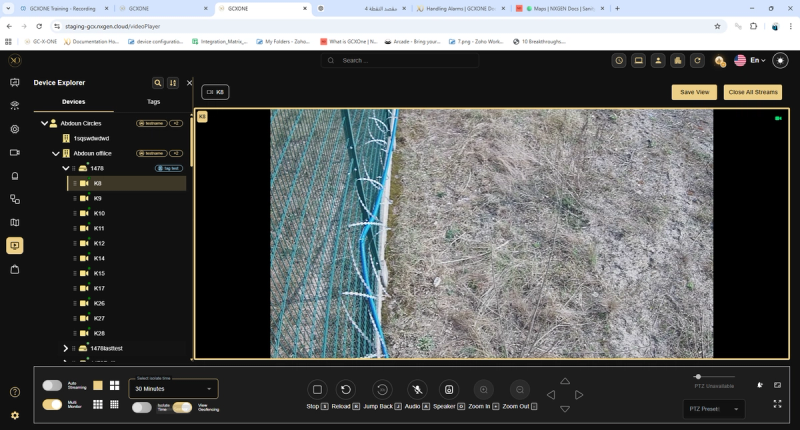 - PTZ Control — Pan, Tilt, Zoom using the directional arrow controls on the right side of the toolbar. Shows “PTZ Unavailable” if the camera does not support PTZ. Use PTZ Preset to jump to a saved camera position.
