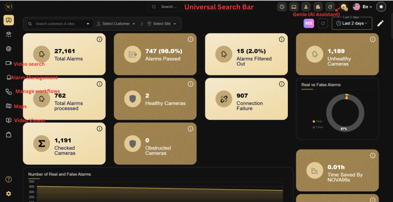 - An operator uses the Universal Search Bar to jump directly to a specific site's camera instead of navigating through menus.