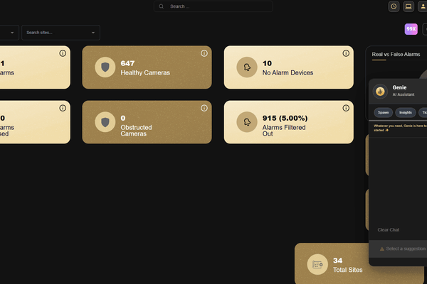 Genie is the built-in AI assistant. Ask questions like "How many alarms did we receive yesterday?", request help with VPN requests, device setup guidance, or troubleshooting.