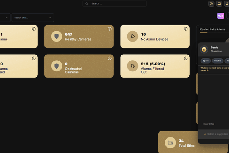 Genie is the built-in AI assistant. Ask questions like "How many alarms did we receive yesterday?", request help with VPN requests, device setup guidance, or troubleshooting.
