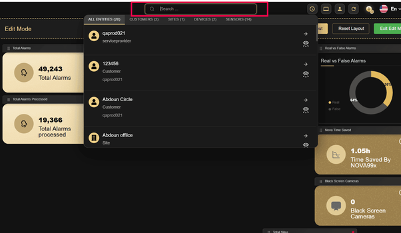 - Universal Search Bar — Search for any customer, site, device, or sensor instantly